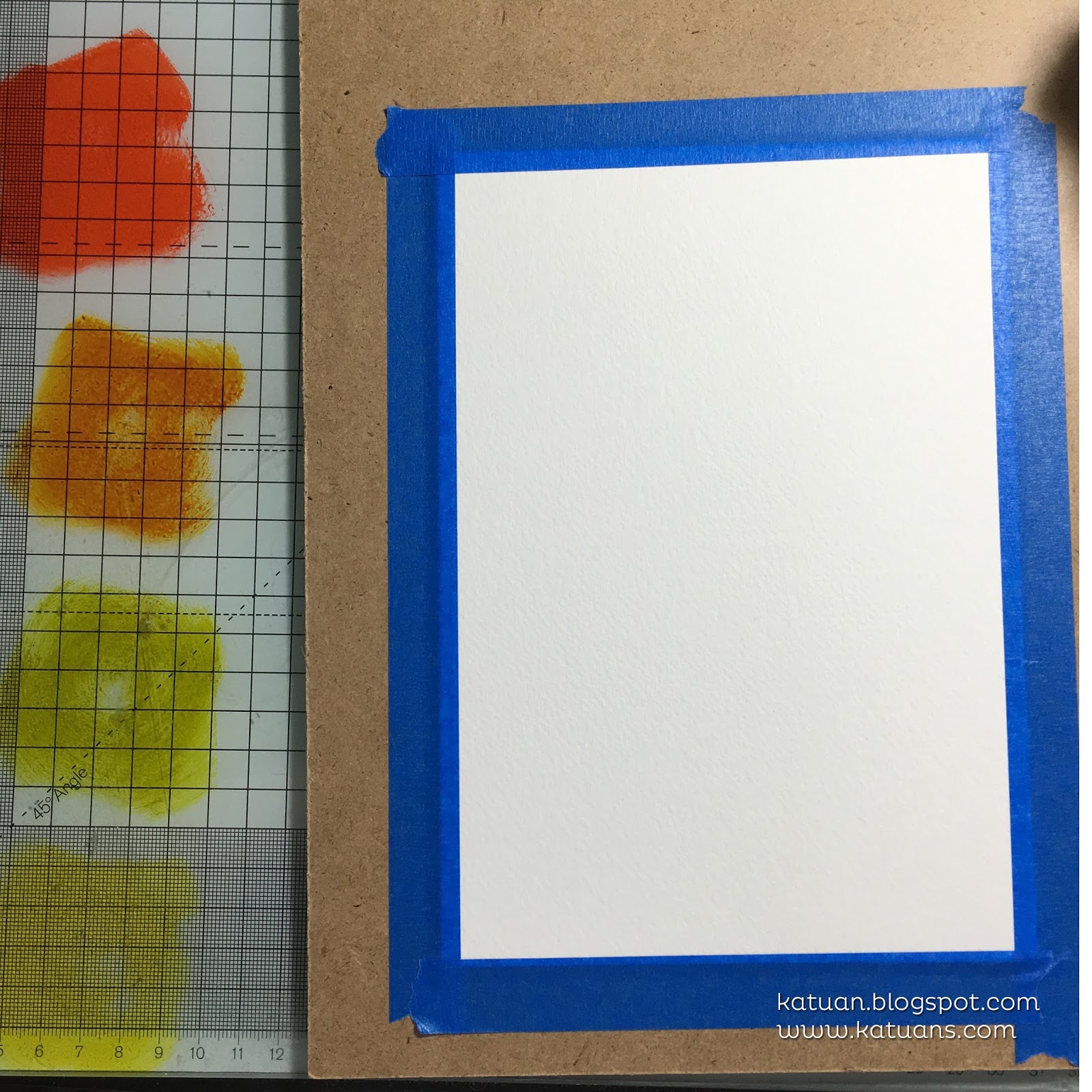 I wanted to try out one interesting technique with a background stamp. I prepared aquarelle paper and four shades of Distress inks. You can try aquarelle pencils or colors as well, but at least it must be something which reacts with the water. I glued the paper to a wooden desk, so that it is easier to work with.